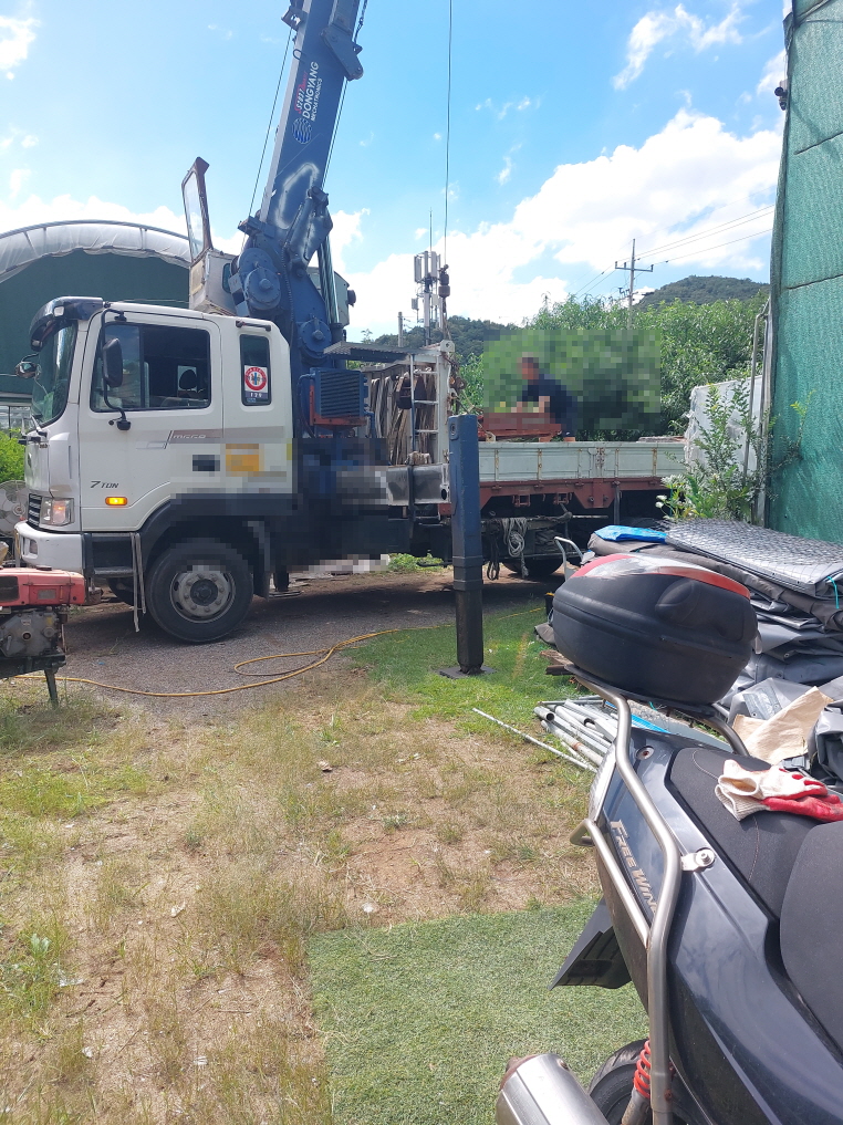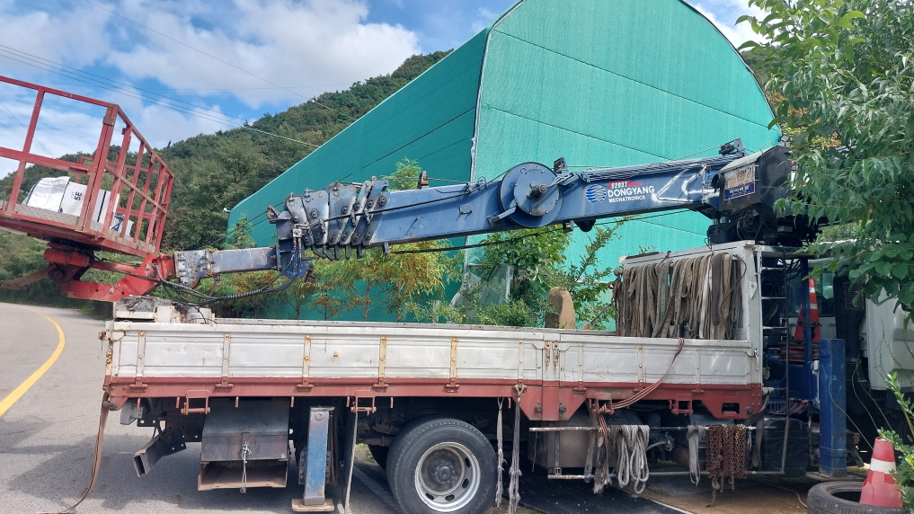농장 구역 특성상 무거운 장비를 직접 옮기기 어려워 7톤 크레인 트럭을 불러서 자재를 내렸습니다.