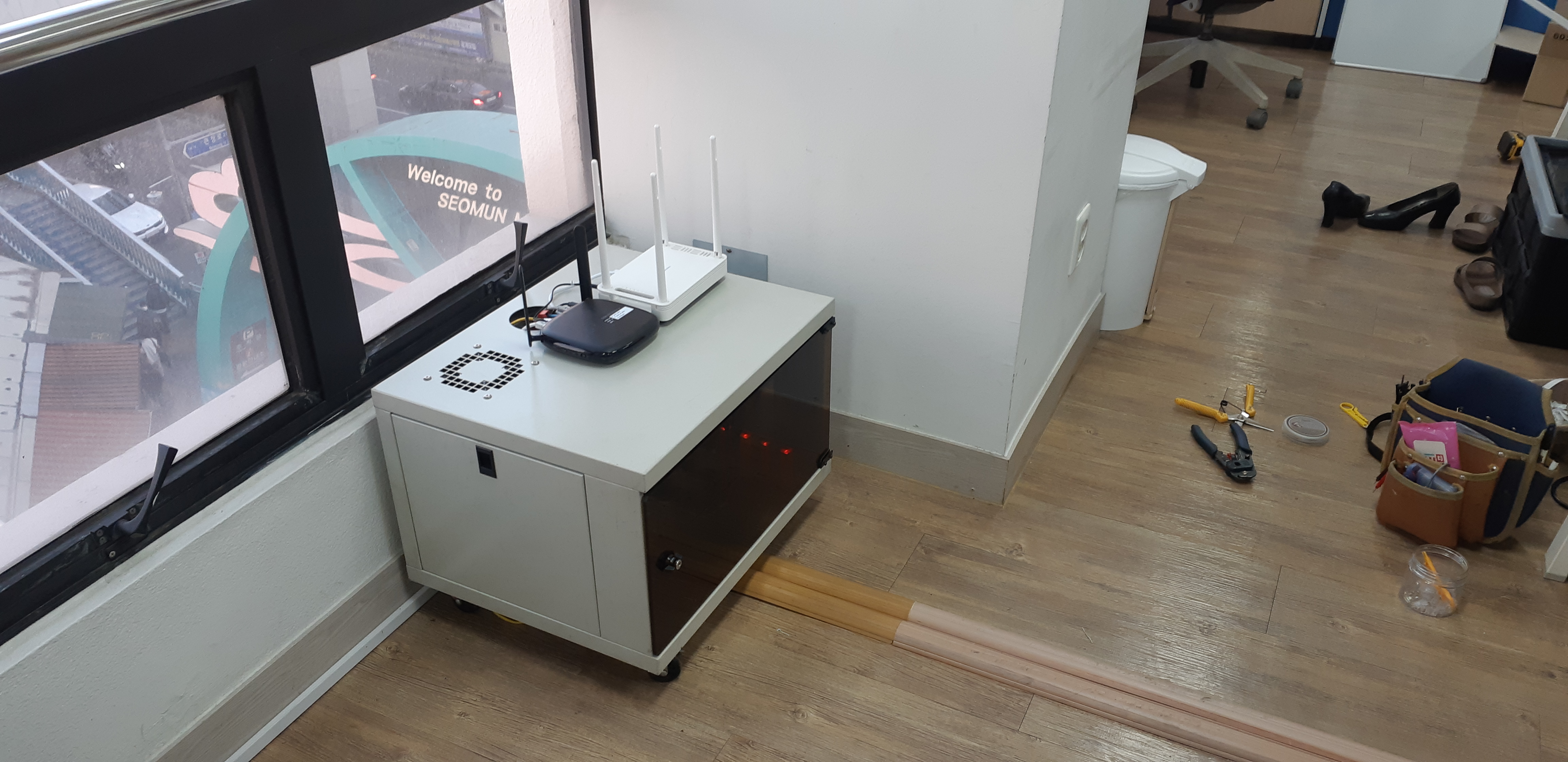 최종 작업 후에는 라우터와 스위칭 허브를 **랙형 장비함(캐비닛)**에 설치하여