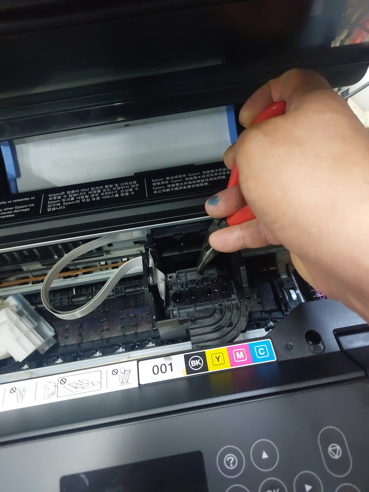 프린터 뚜껑을 열고, 헤드를 조심스럽게 분해했습니다.