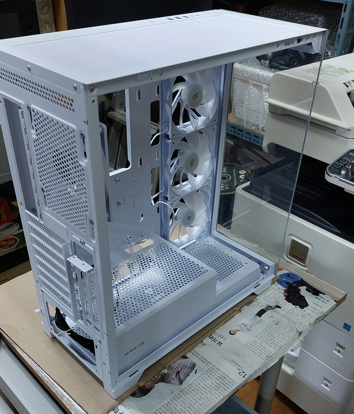 전면 팬은 무려 3개, 후면과 상단까지 총 6개의 팬이 맞물려 케이스 내부의 공기 흐름을 책임집니다. 팬과 요즘 유행하는 RGB 조명을 연결하는 케이블을 깔끔하게 정리하는 데 시간이 꽤 걸렸지만, 마무리 후 케이스 내부를 바라보니 마치 미래지향적인 기계가 된 느낌이었죠. 😎