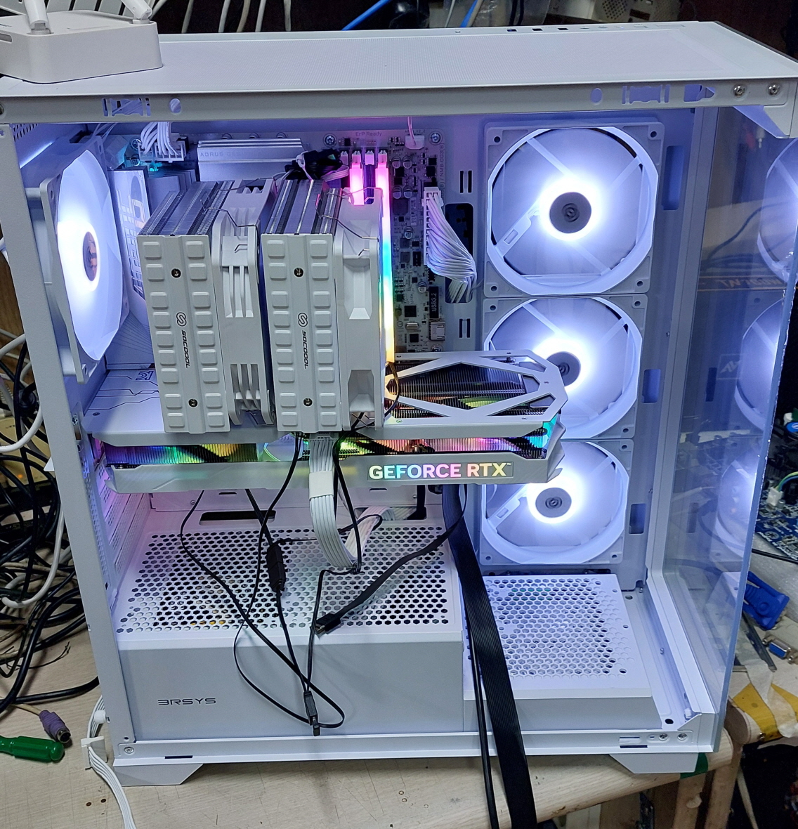 가장 손이 많이 간 부분은 바로 쿨러 설치였습니다. Socool의 듀얼 타워 쿨러는 생각보다 크고 묵직해서 고정하는 데 꽤나 애를 먹었죠. 하지만 팬을 장착하고 나니 멋진 RGB 효과가 더해져서 더할 나위 없이 만족스러웠습니다.